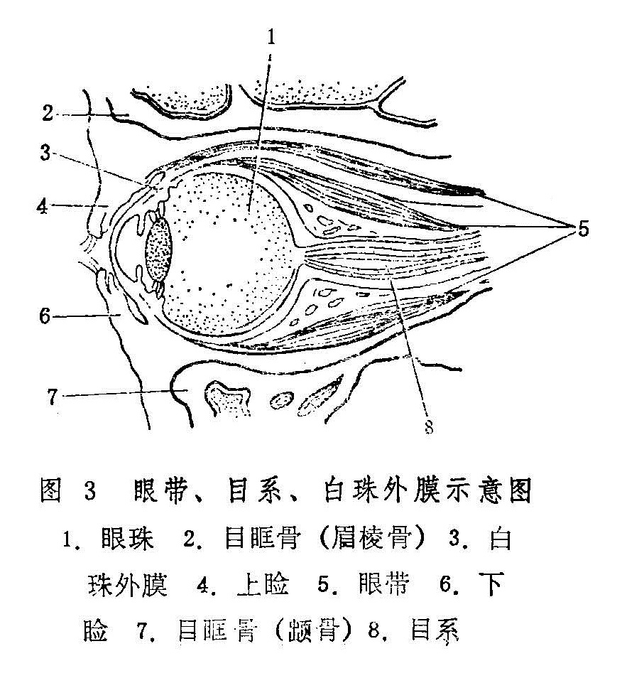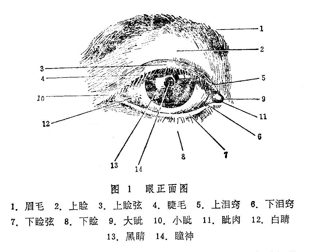 眼珠居于眼眶之内,前部的裸露部分,正中为黑睛,黑睛之周围为白睛(图1)。眼珠后面则有目系上通于脑。
